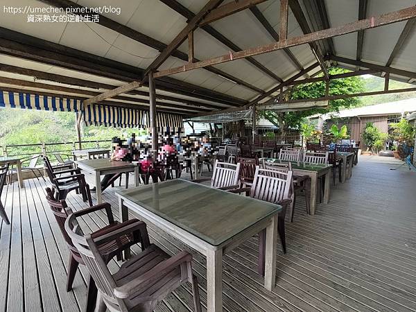 再往裡走,綠樹下的小小庭園,即可看到搭建出的用餐區。只有屋頂,三面是通透無牆壁,因此相當通風,真的坐在咖啡廳即可賞海景。