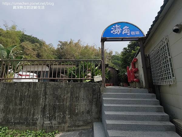 停好車後,看到山坡上一棟房子,那是海角咖啡以前還是土雞城時期的餐廳,現在的咖啡廳在旁邊,請循著停車場角落的階梯,依海角咖啡招牌走去。