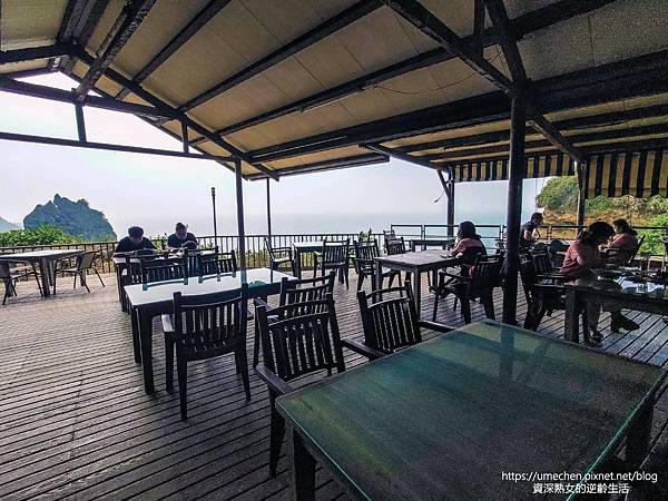 因地處高處的海崖上,外圍設有欄杆,故外圈位置應是熱門坐位。惟我們造訪時,欄杆旁的坐位太陽直射,因此選擇了不曬的位子,要拍照、賞景時再移位即可。
