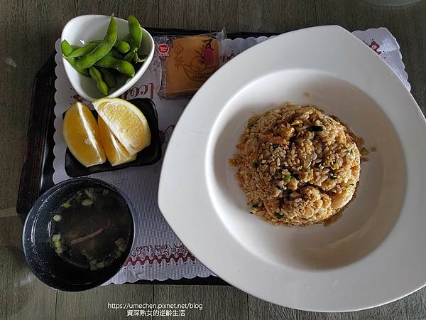 我們正餐只點了一份蝦仁炒飯,以套餐方式呈現,有毛豆、水果、熱湯、煎餅。