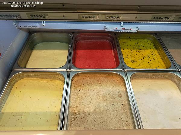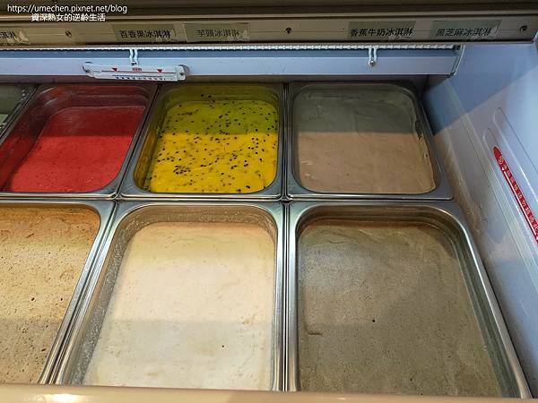以豐富、台灣在地水果入味的冰淇淋,部份看得到水果的風貌,或是混合後的小點點,冰品顏色看起來天然。
