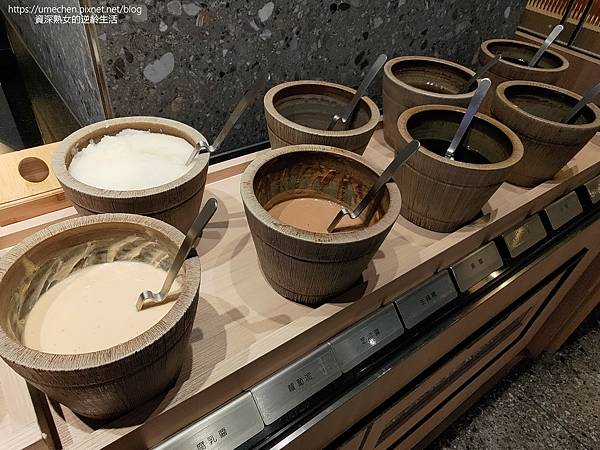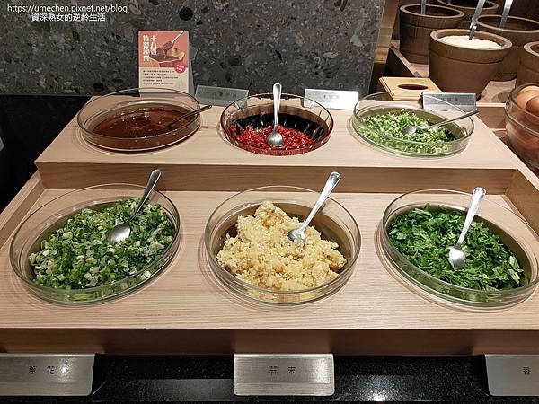 以竹紋小桶盛裝芝麻醬、生辣椒、腐乳、蘿蔔泥、香油、黑醋、白醋、醬油等,沾醬diy材料很多,生雞蛋在放在一起,還有蛋清、蛋黃分離小器物,就是貼心。