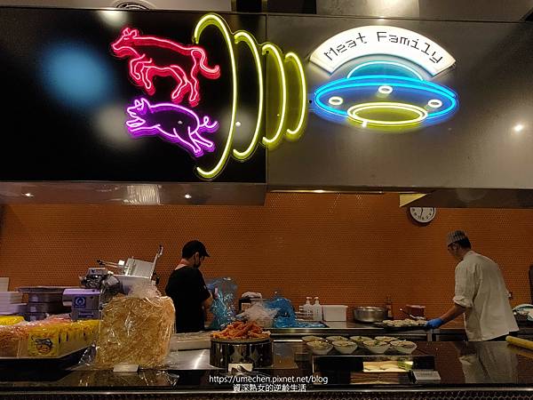 例如,飲料區是潛水者浮出水面、放送電波;切肉片的開放式工作廚房,霓虹燈圖案是太空船放送出牛、豬,創意又可愛的畫面,促進食慾唷!