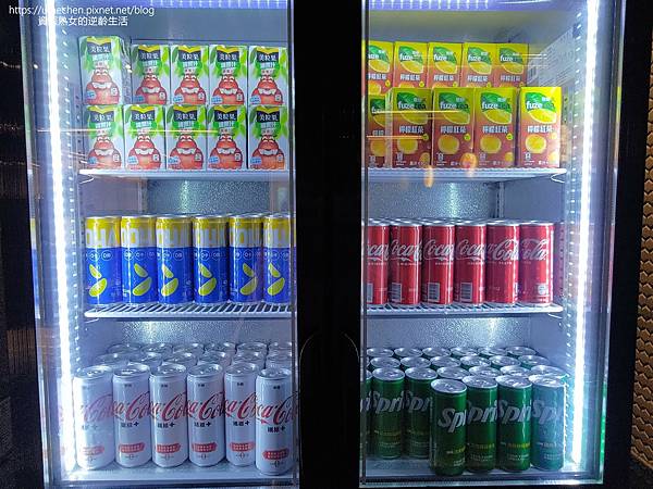 冰箱裡的罐裝冷飲,有可樂、LIGHT可樂、雪碧、氣泡飲、檸檬紅茶、美粒果等品項,只是有點大瓶,一個人喝一瓶太多,適合同桌分飲。