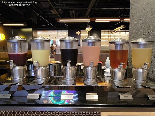 烏梅汁、柳丁汁、青草茶、蜜香紅茶、蜂蜜檸檬醋,顏色各不相同,一整排就是有氣勢。還有復刻懷舊鮮奶茶,我最愛。