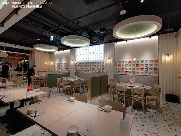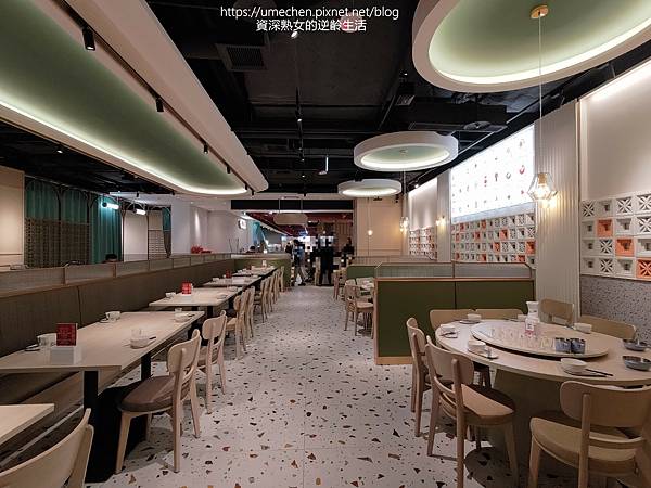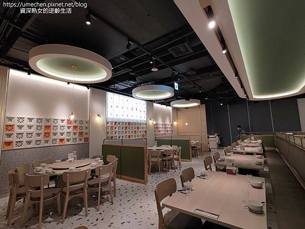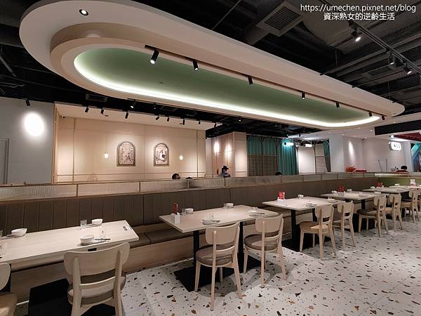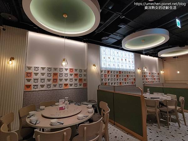 清爽、舒適用餐空間,淺土黃色調,以淡墨綠的燈台、座位隔板讓視線不單調。