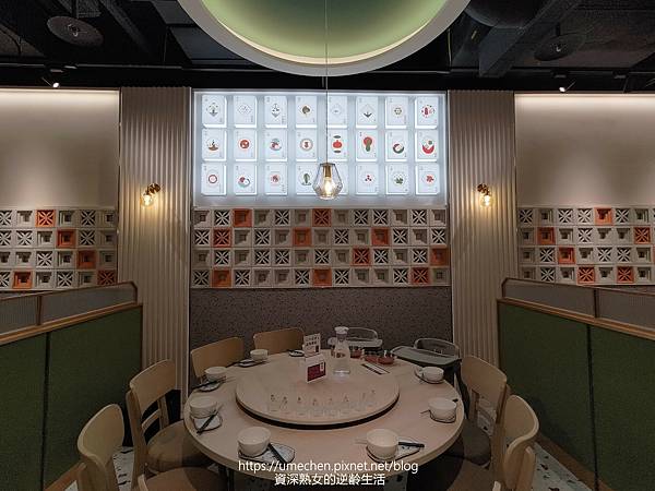 圓桌座位區的牆面,擬真的庭院圍牆縷空水泥花磚,淡橘色縷空磚在乳白牆面上,洋溢著昔日的青春歲月,舒服極了!