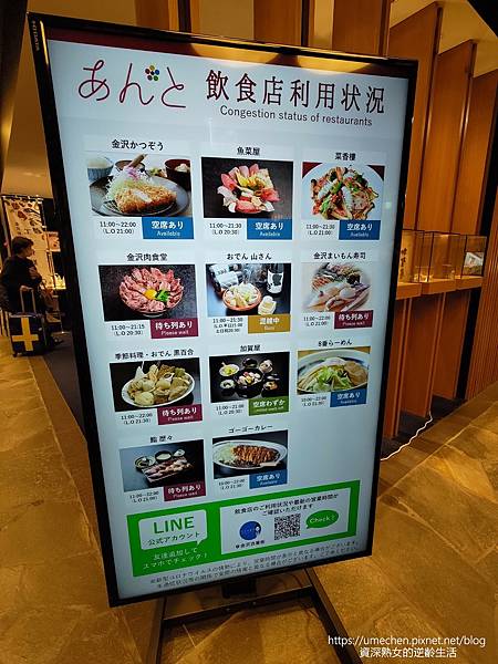 晚上4人想找吃的,往百番街あんと/ Anto走來,正值用餐時刻,人潮滿滿,一時之間無法決定到哪裡吃。後來發現,商店街非常貼心,設有各餐廳是否客滿的智慧顯示,也可以加LINE更方便。