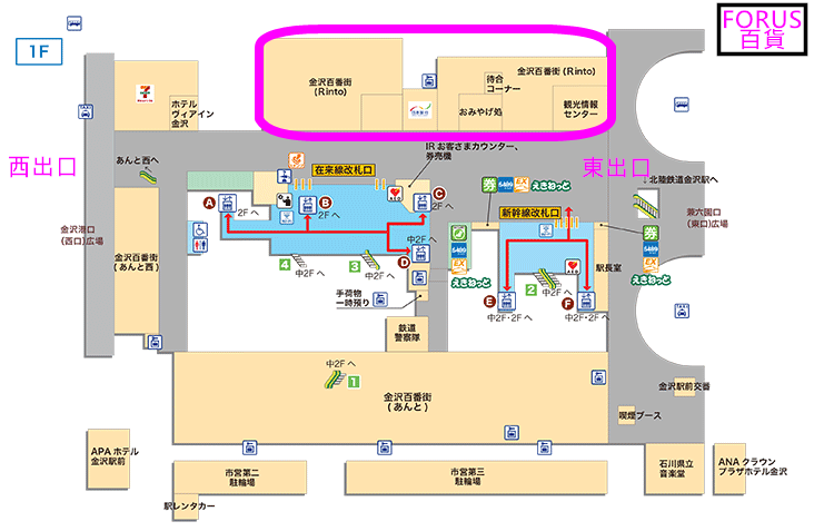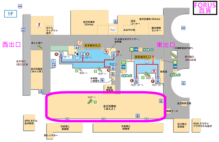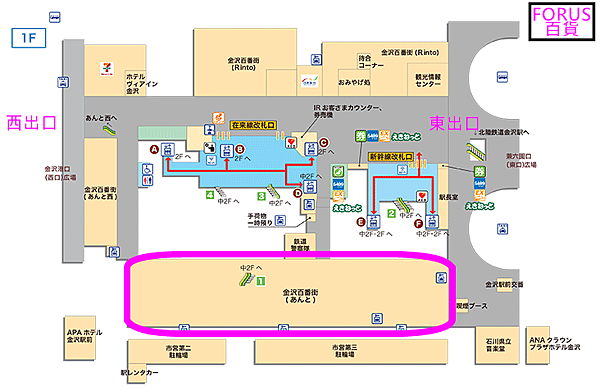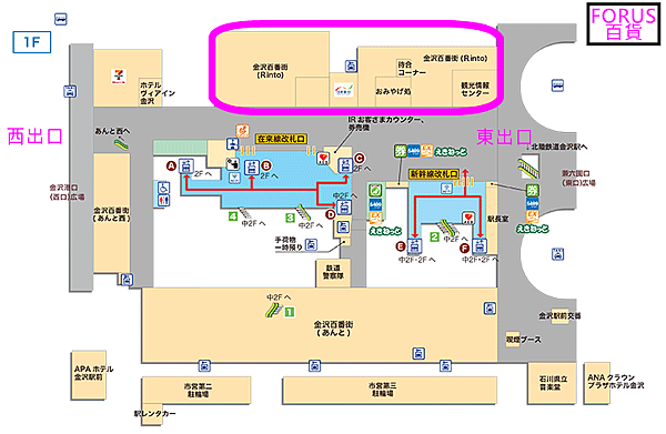 JR金澤車站的一樓,在中庭大廳的左右兩邊,各有賣場、美食街。背對最美麗車站的鼓門,即背東朝西,一樓右邊是 百番街Rinto;左邊是百番街あんと/ Anto。