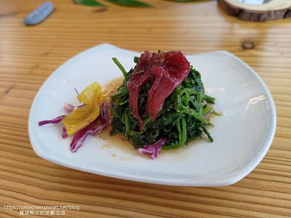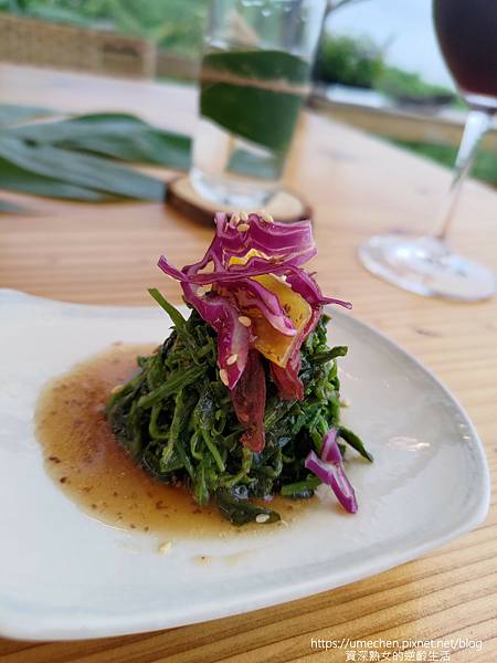 在地的野菜:過貓、紫背菜,製成的沙拉,加上自製青木瓜醬料與洛神花,成就這道爽口、有著特殊野菜風味的好沙拉。