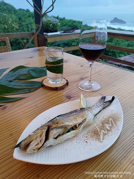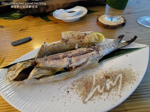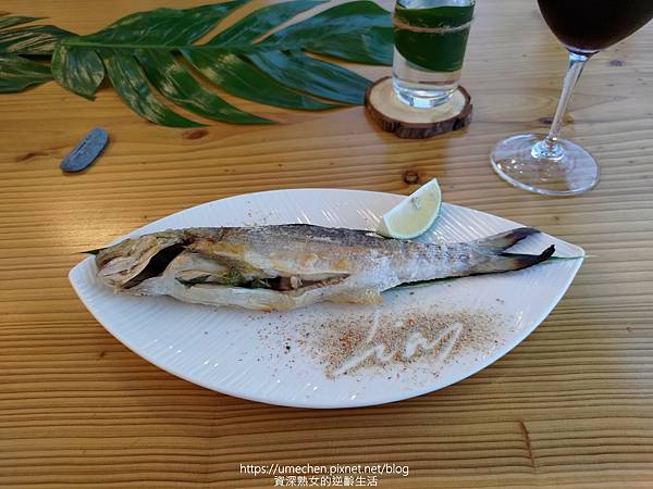 在地野生午仔魚,魚肚裡塞進刺葱,表面抹上海鹽以鹽烤處理,這道讓三姊妹讚不絕口。