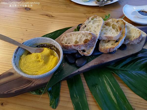 顏色很漂亮的沾醬,是南瓜和鯡魚做成的鮮奶油醬。
