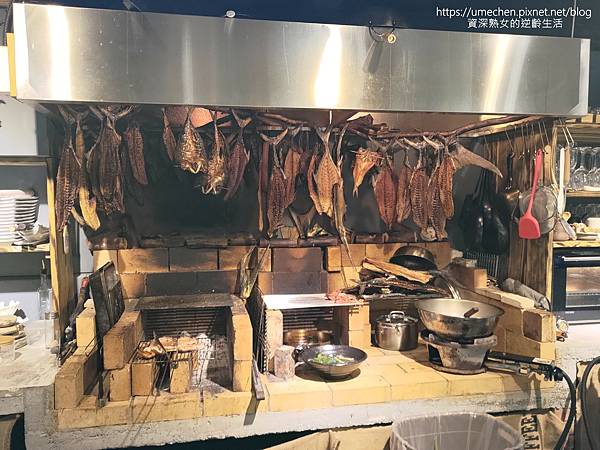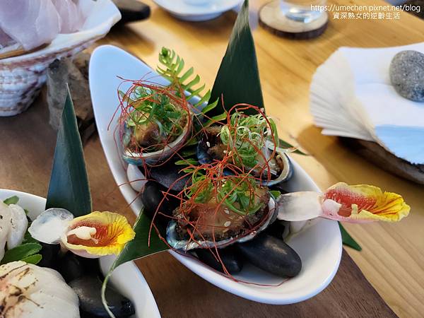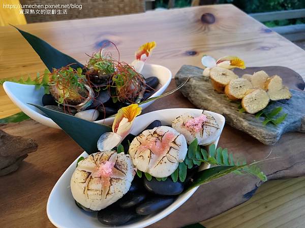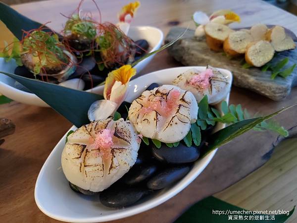 以碳火直烤,比瓦斯爐作業的難度又高了些,包含前面多道海鮮也有採用相同處理,因為這是阿美族人常用的料理手法,將阿美族文化展現在餐食上。