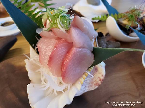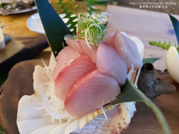 生魚片,是在地漁港捕獲的新鮮鬼頭刀,瞧那色澤,美得像花!