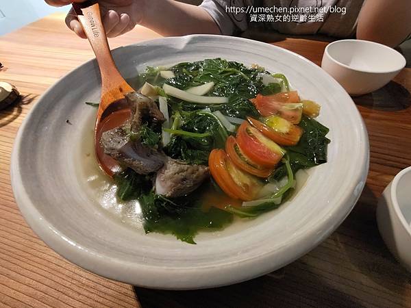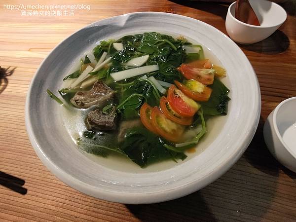 以排骨熬煮的鮮味為基底,野生昭和草、當種植的地瓜葉,組合這麼搭,野菜的天然清爽滋味融入湯裡,讓人難忘的好味道。
