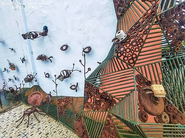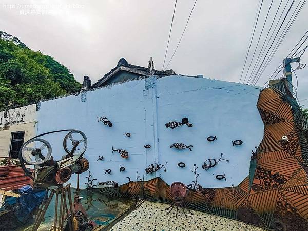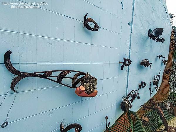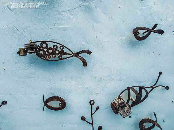 遠遠看,是一台傳統的電影放映機,正在放映出牆壁上的魚群;近近看,原來放映機、魚兒都是由報廢的農機具零件所組成。