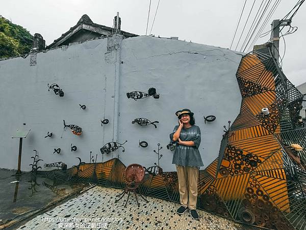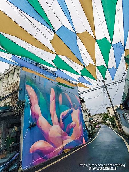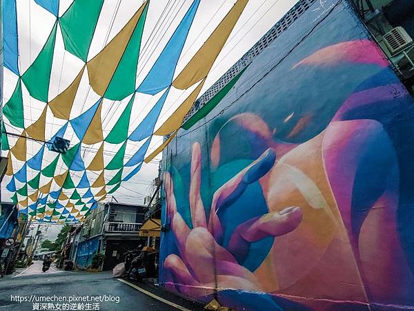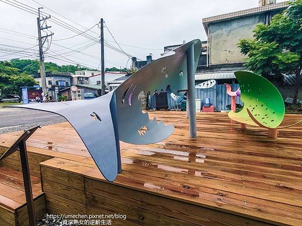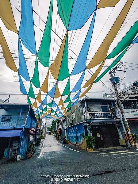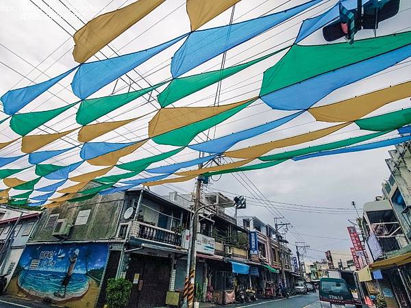 在老街中段的十字路口,路面上方由藍、黃、綠三色網材組成,即為鬼頭刀魚身上的顏色。