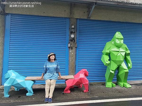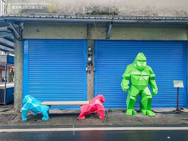 綠色的站姿大金剛,如同公車站牌;2隻紅藍彎曲爬姿的小金剛,則為座椅兩端的支撐,像扛著椅子前進,形成一張可愛的公車座椅!