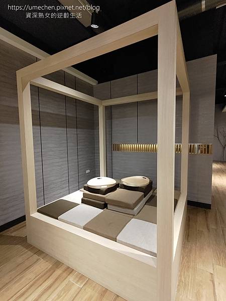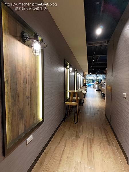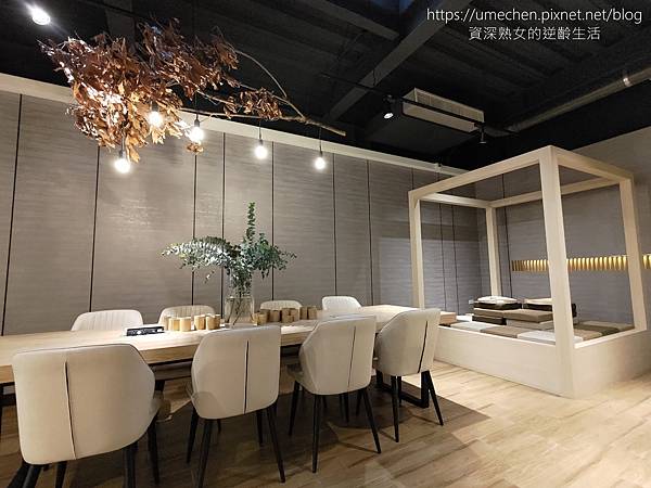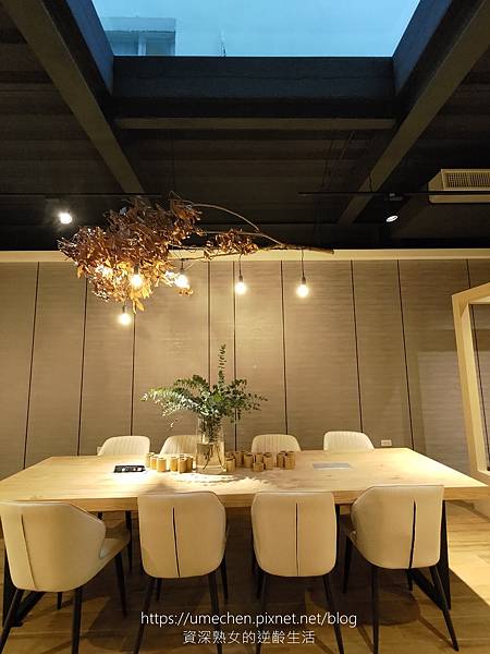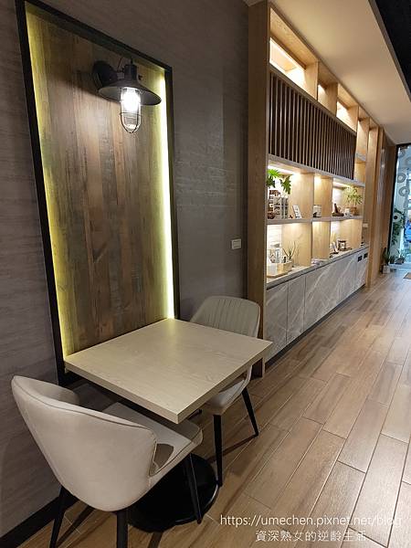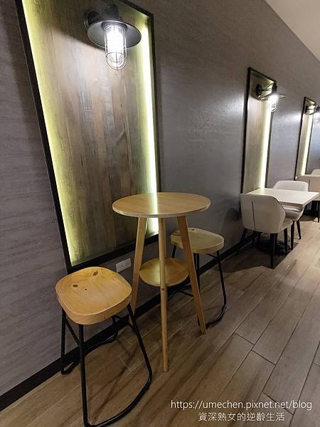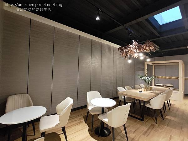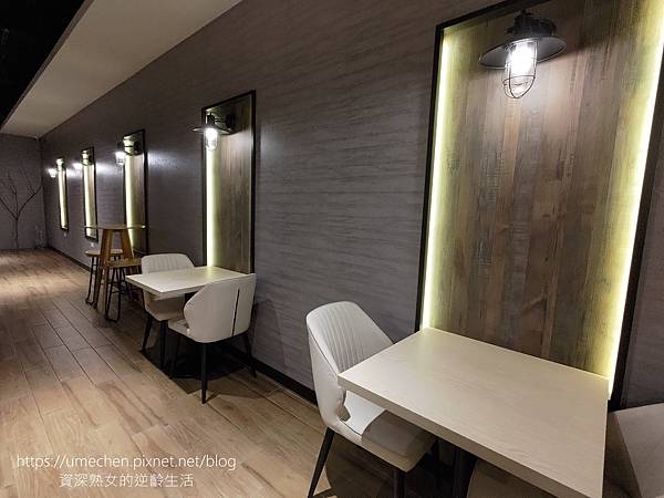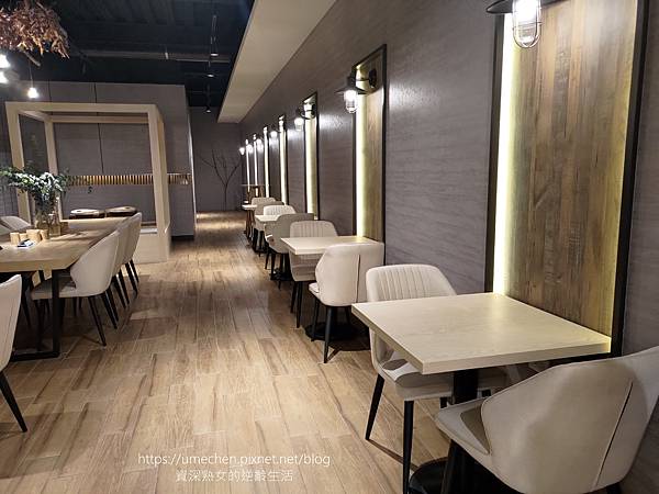 用餐區風格為簡潔的現代風,灰色系牆面;黑色天花板;土黃色地板;淺色桌椅,這一空間的組合,是沈穩的、又能放鬆的氛圍營造。