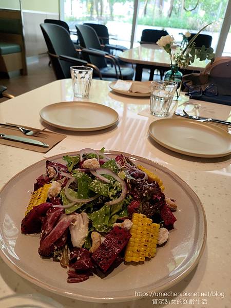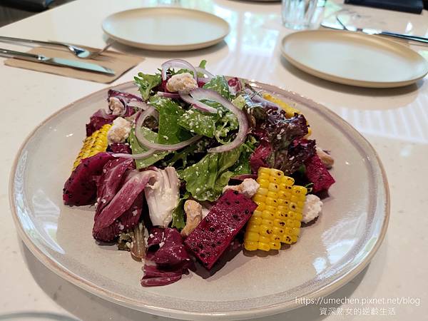 多樣的綜合生菜、烤玉米、水果、堅果……等,加上醃製的水果醬調味,清爽又健康。