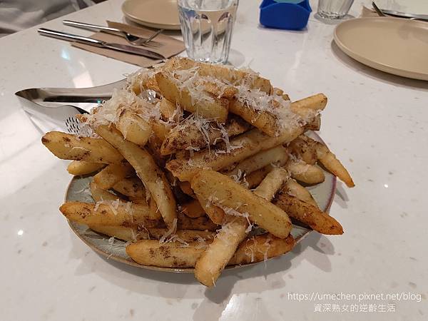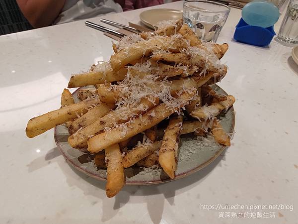 非常適合大家一起分享的薯條,採用美國粗薯,佐以刨得薄如蠶絲的松露調味與妝點。