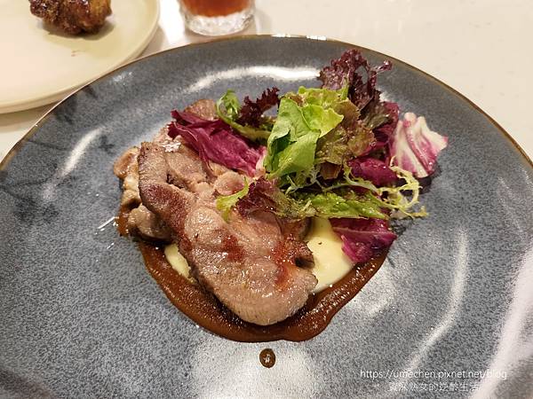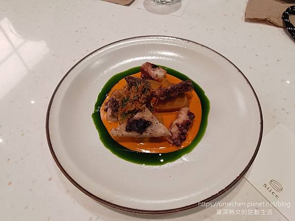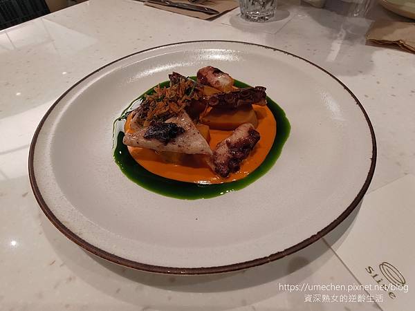 我對這道菜名很好奇哩!光是墊底的橘紅+綠色醬汁,就夠神秘了!非常適合搭配白酒享用,章魚經過舒肥過程,保有Q度的咀嚼感勁。
