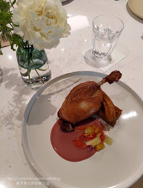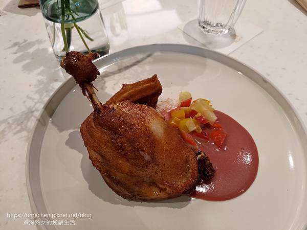 我的油封鴨腿與吉拿棒也很有火花,玫紅色的醬汁是紅酒紅槽醬,鴨腿本身夠厚實,煮得很透,很方便以刀叉切食,淑女也可以優雅吃完這份油封鴨腿。