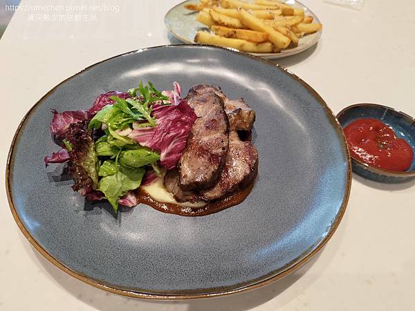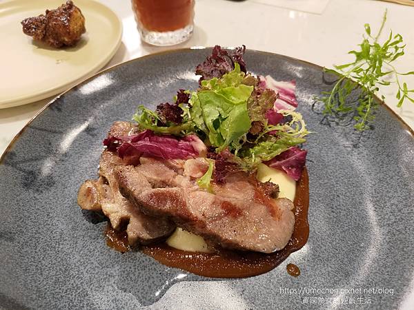 碳烤伊比利豬肉排,是這天我們點的主餐當中倍受好評的。伊比利梅花豬料理得內外層次分明,風味極佳,佐以味噌醬、馬鈴薯泥與生菜,同行者一邊吃一邊稱讚。