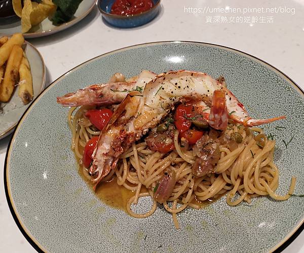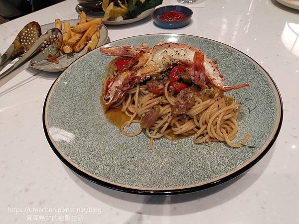 這天唯一一道挑戰到同行者的味蕾線,明蝦似乎不是新鮮現處理的,義大利麵味道太重了些,必須要喝氣泡水來平衡才行。