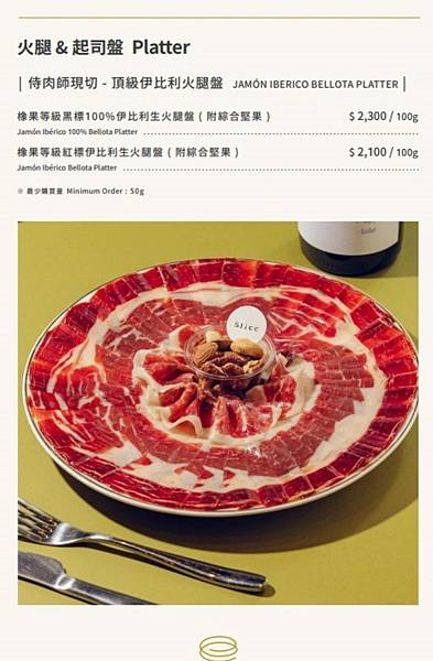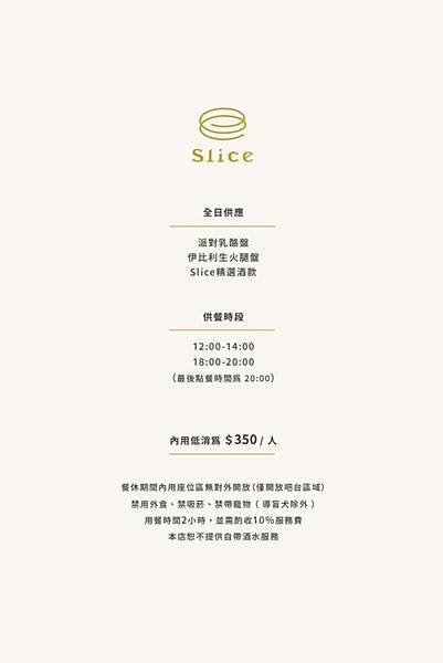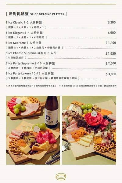 Slice以歐陸飲食文化為主打歌,這裡可吃到前面有提過的乳酪起司、火腿煙燻肉品各式切片組合拼盤,不論一人或多人都能提供。