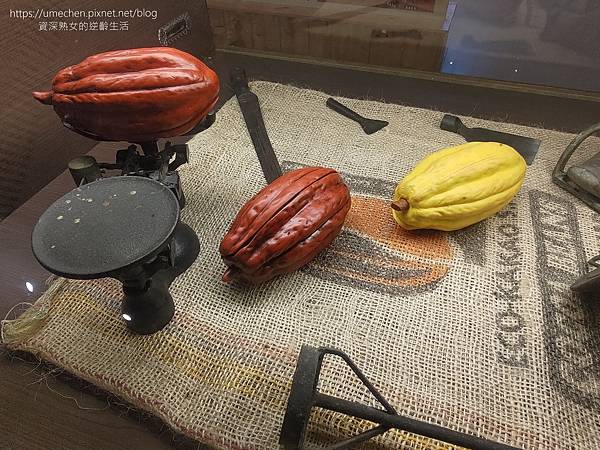 展覽室的中間,則讓我們看到可可豆的模樣,以及以前製造巧克力使用的模具或工具。