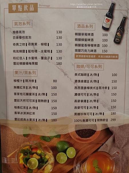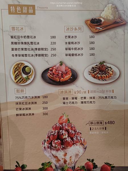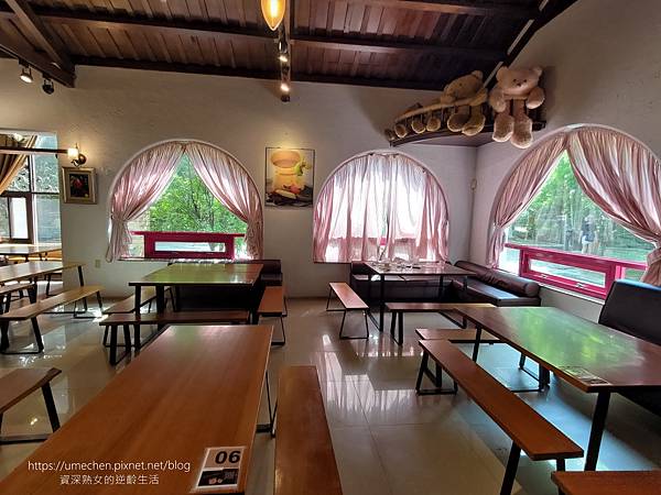 用餐環境樸質中帶點夢幻。木質天花板、桌椅組;半圓拱式的窗戶、粉紅色輕透紗窗;牆面高處的熊熊樂園,吸引我們女子4人在此享用下午茶。