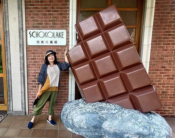 光是戶外區就好好拍照。拱型騎樓下的休憩坐椅、紅磚牆,門口的超大塊巧克力……等,忍不住拍了好幾組人像照。