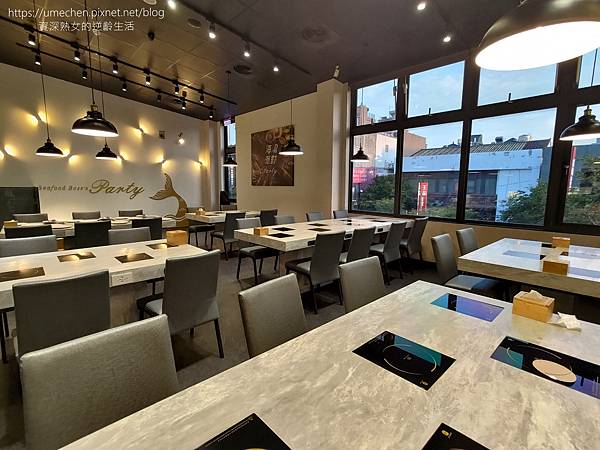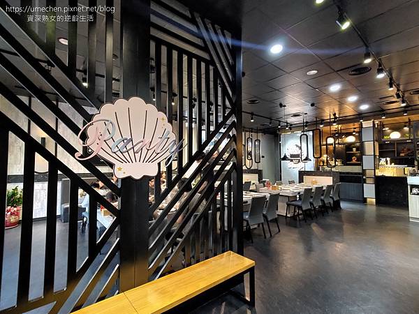 室內用餐空間共2樓層,均為白色大理石紋光滑桌面,沈穩的深色椅,餐盤也是白色的,飾以黑色條紋裝潢,整體明亮感充足,是一間整齊又乾淨的海鮮餐廳。