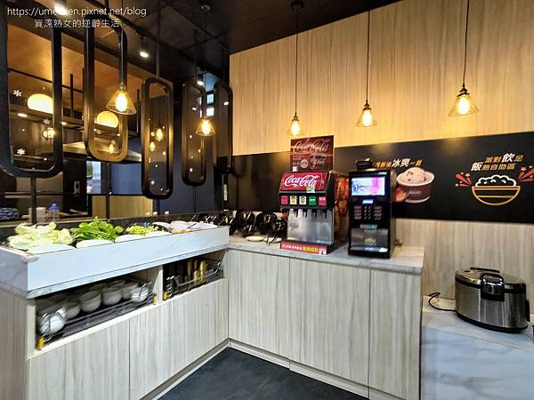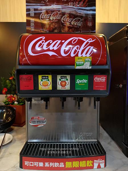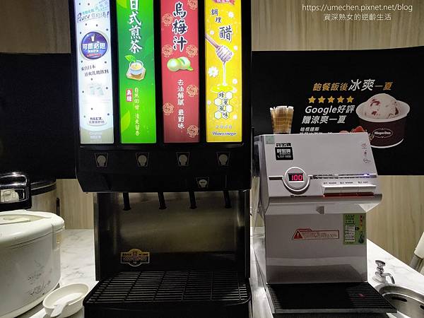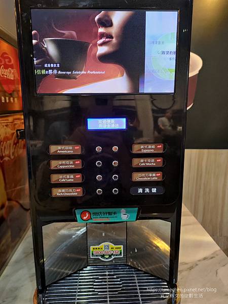 自取的冷飲有可爾必思、日式煎茶、烏梅汁、蜂蜜調理醋;另一樓是可口可樂冷飲機,有5種飲料;還有熱咖啡機。