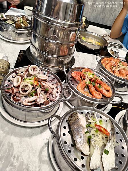 海鮮蒸煮過程,全程有服務人員掌控每一籠清蒸的時間,客人不用自己計時!蒸好後,服務人員會將蒸籠裡的海鮮端出來,我們張嘴猛吃就對啦!