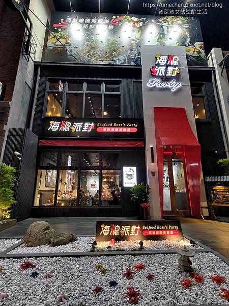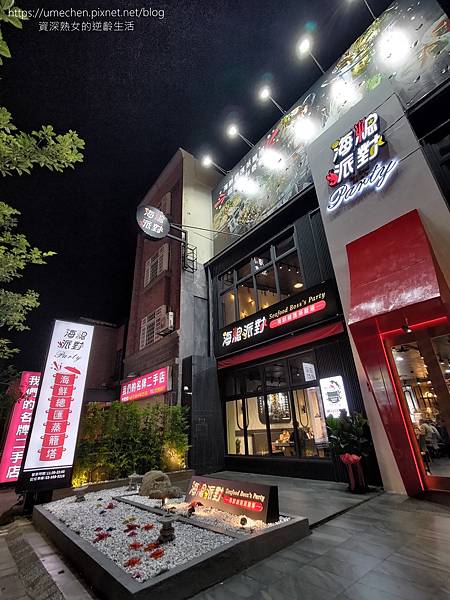 海總派對竹北光明店,建築非緊臨馬路,有一大塊空間。前半部舖了白色小石頭,上面有很多隻色彩鮮豔的螃蟹、龍蝦、魚……等玩具,像海中生物浮遊在海洋波浪的泡泡上。