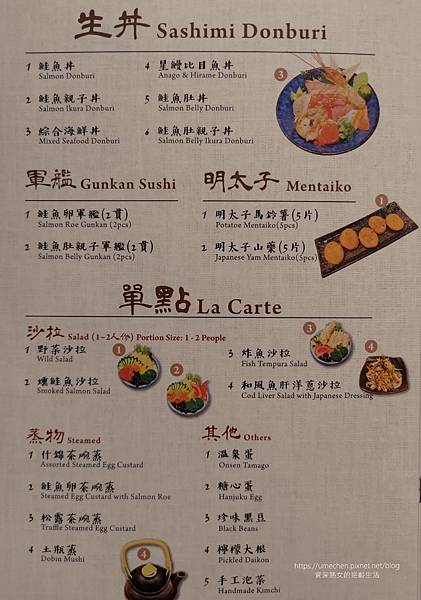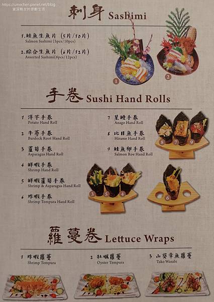 還有丼飯、軍艦、壽司捲、壽司、生魚片、沙拉、蒸物、手捲、蘿蔓捲……等。菜色稱得上豐富而多樣。