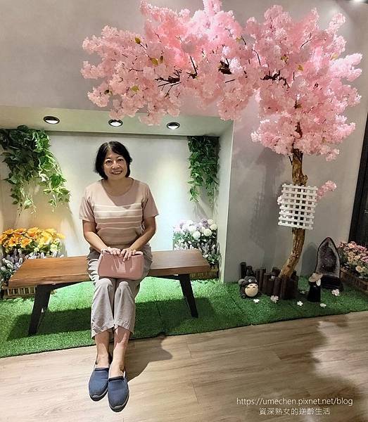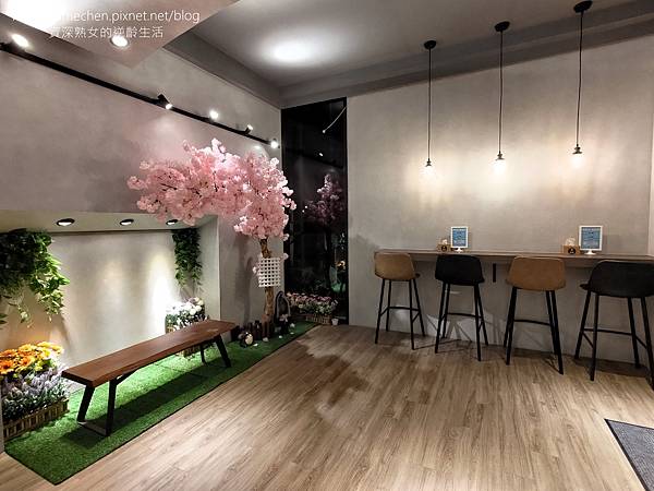 人造櫻花樹、草皮、垂掛的人造植栽與花卉,以及一張木椅,不算有創意的設計,但絕對夠你拍個美美的合照、人像照。