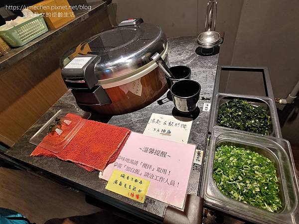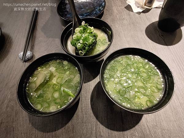 自助吧的形態,整鍋味噌湯自取,旁邊有海帶芽、葱花可添加。