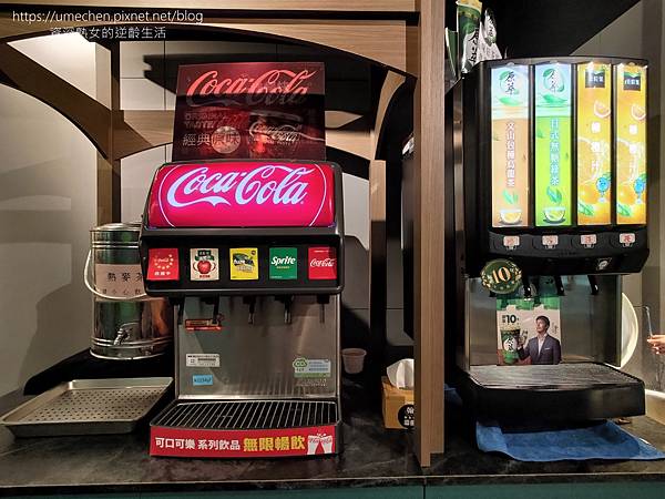 冷飲機有2台,一為經典款的可口可樂、雪碧…等;另一台是原萃綠茶、烏龍茶、美粒果的果汁;還有一桶熱的麥茶。