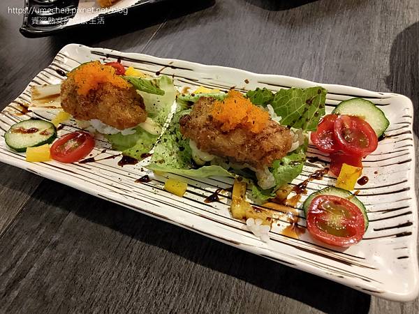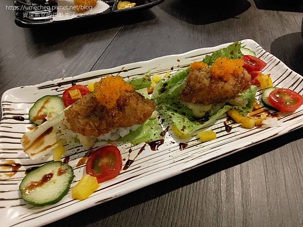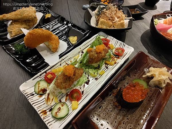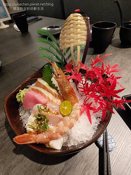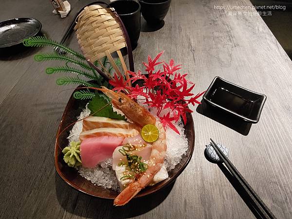 生魚片只有2款:鮭魚、綜合。綜合有6片,其實一個人吃的份量也沒問題,還有一尾去了殼的鮮蝦。生魚片還有擺盤裝飾,只是我個人覺得美感稍低。