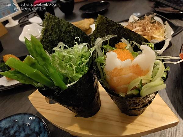 我品嚐了蘆筍手捲,比預想中更美味。海苔、菜絲的脆度非常爽口,也具有十足解膩功效,搭配炸物一起享用超棒的。