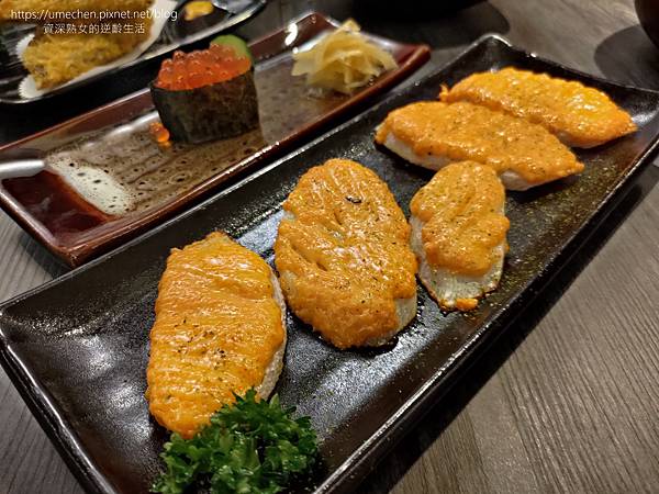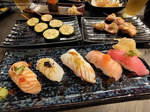 沒有特別的擺盤與盤飾,綜合握壽司5貫排排站,海鮮種類、搭配的食材完全不同,很想一人獨佔哪!我吃了3個,很有水準的握壽司。
