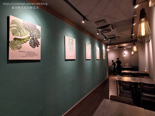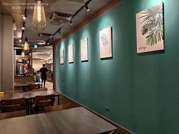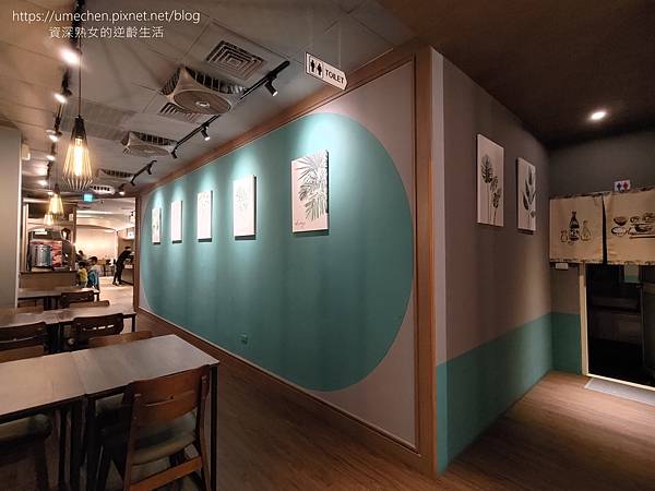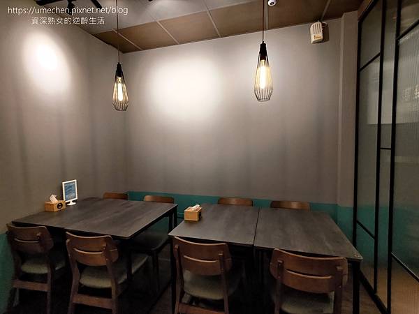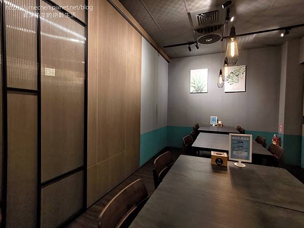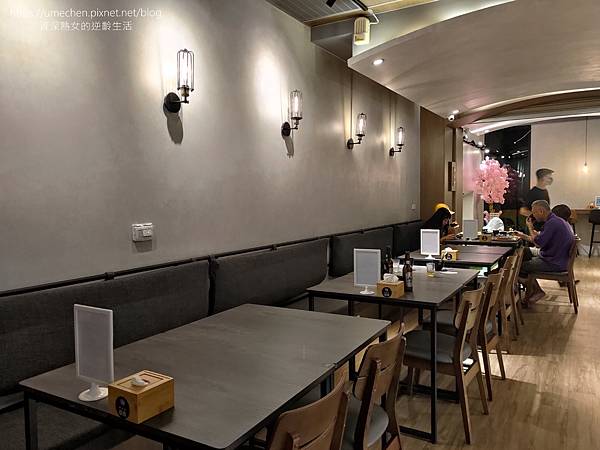 店面坐位排列為狹長的L形,櫻花網美牆之後的坐位,是靠牆的一整排,一直到屋子的最後面,才拐出L型,後面這區在人數夠多時,也適合包場。