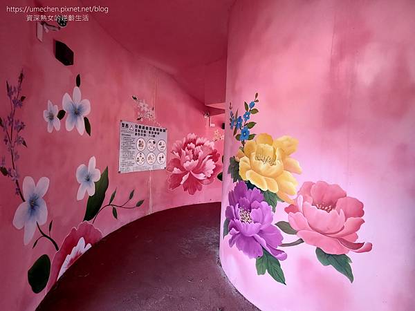 像防空洞的小空間裡面,4面牆壁都有滿滿的彩繪。