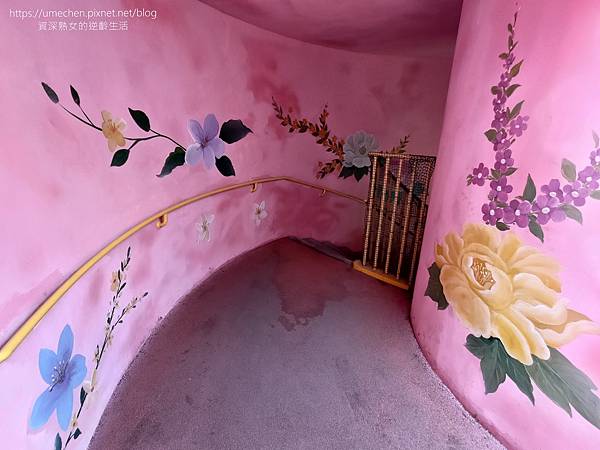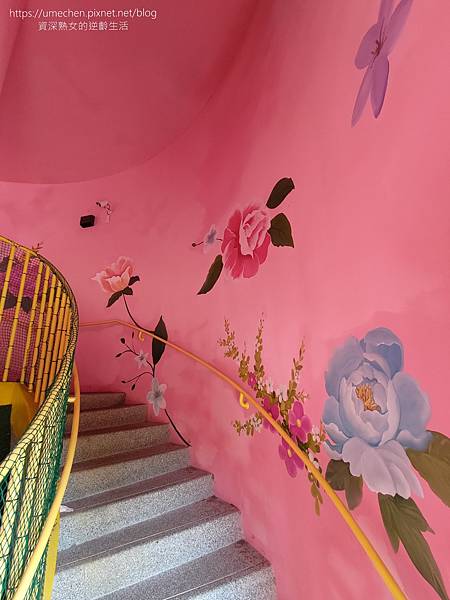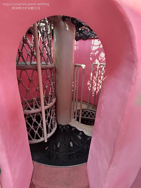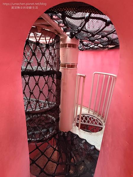熟女實際走到茶壽溜滑梯裡,樓梯點綴著客家花布圖案,裡面的空間很明亮。樓梯中間也設有遊戲機關,像樹屋探索的感覺,三條溜滑梯的高度也不同,適合不同年齡層小朋友遊玩。