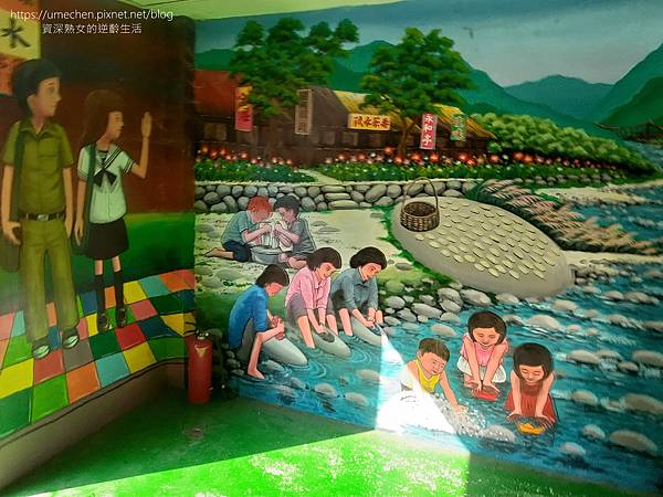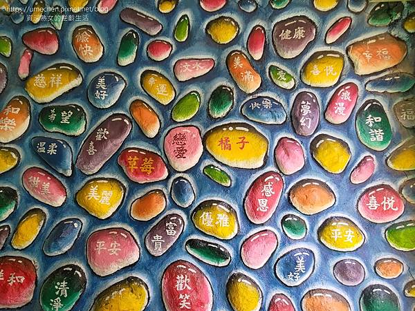 2面為舊農村時期的汶水剪影;另一面以一顆顆石頭為輪廓,多樣的色彩搭配2個字的詞句,是很好拍的牆面。