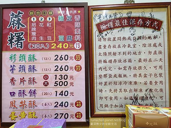 除了上述分享的麻糬、蛋黃酥,在大元餅店的內外可看到好幾疊的紙盒,畢竟由統糕餅起家,店內還有賣鳳梨酥、彩頭酥、芋頭酥、香片酥、口酥餅,種類不少。各口味也都經過時代的考驗,希望日後有機會品嚐到其他口味,或買來拜拜、當伴手禮也很適合。