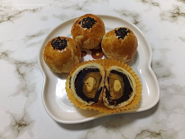 看它的橫切面,鴨蛋黃大抵已全乾;豆沙幾乎全包裹住鹹蛋,因此每一口都能咬到酥皮、甜的豆沙、鹹香的鹹蛋黃,真的吃不膩呀!沒有到十分驚豔,但絕對有80分。